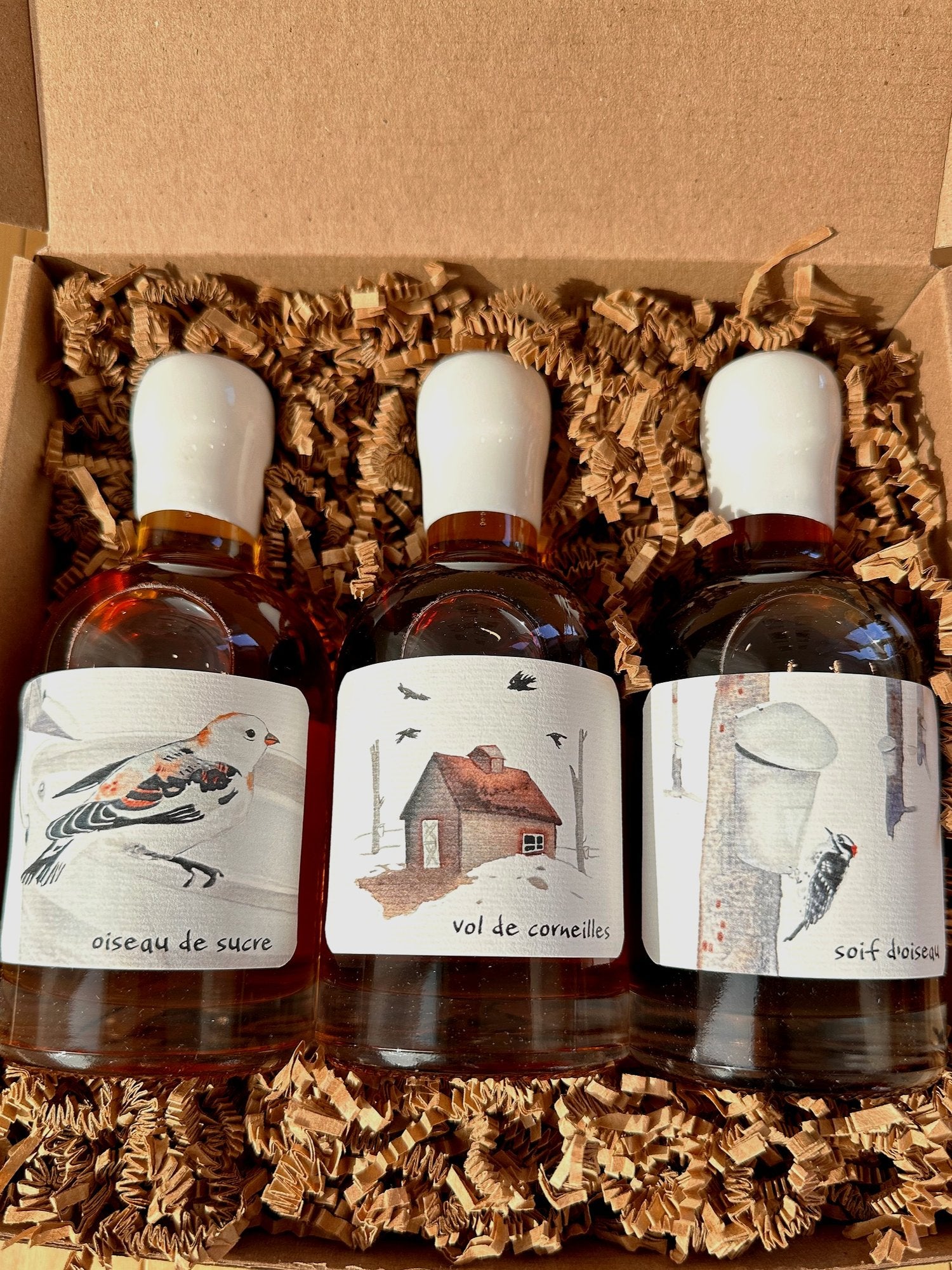 Ces secrets sucrés, bien gardés par les vieux érabliers, vous sont révélés ici, au travers de ces trois bouteilles de sirop d’érable.