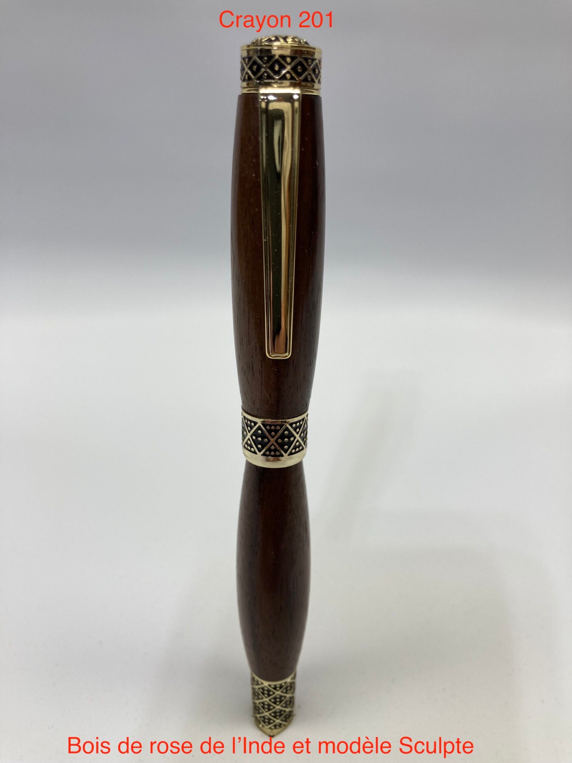 Ce crayon est de grosseur moyenne et se tient bien en main. Le capuchon, la bague centrale et la pointe sont ornés de tresses gravées.